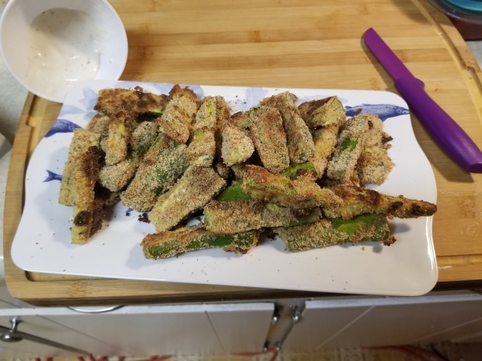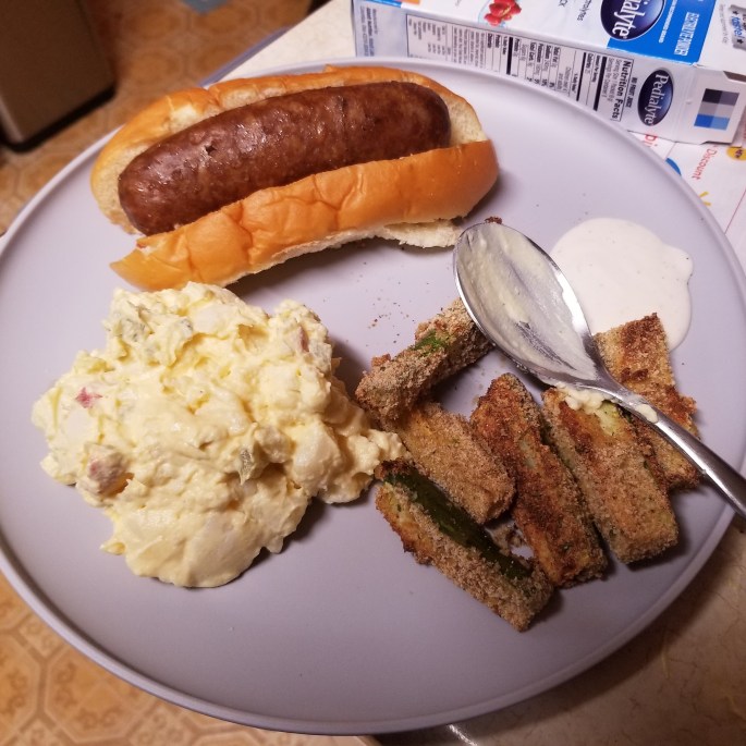 Our 4th of July dinner: Beer Brats cooked in Left Hand Brewery Nitro Milk Stout (So good) and Jalapenos, Potato Salad (store bought, not so good) and the delicious Zucchini Fries with Ranch for dipping.