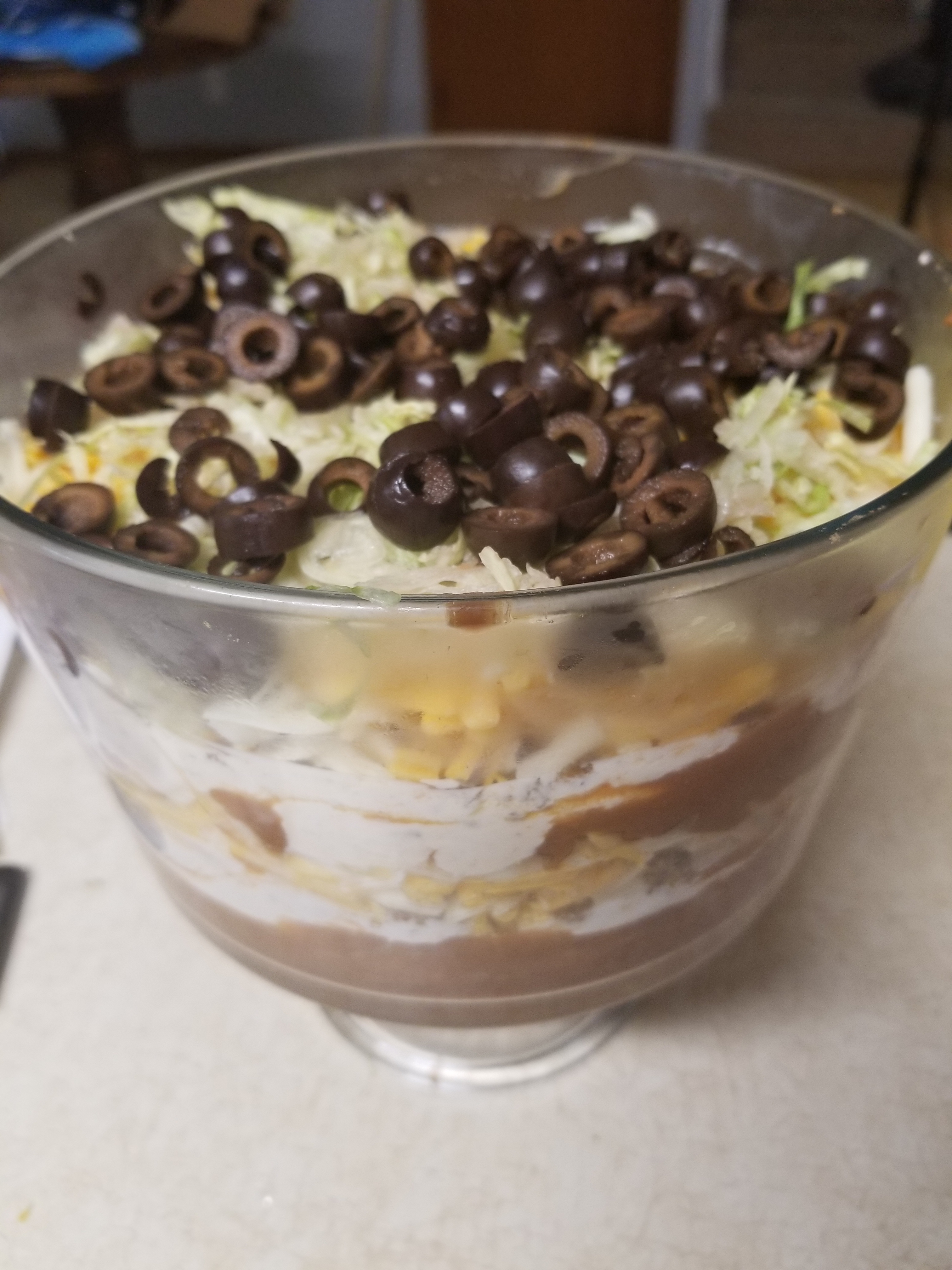 6. Refrigerate for at least 30 minutes for the layers to set and cool and then serve with tortilla chips and enjoy!